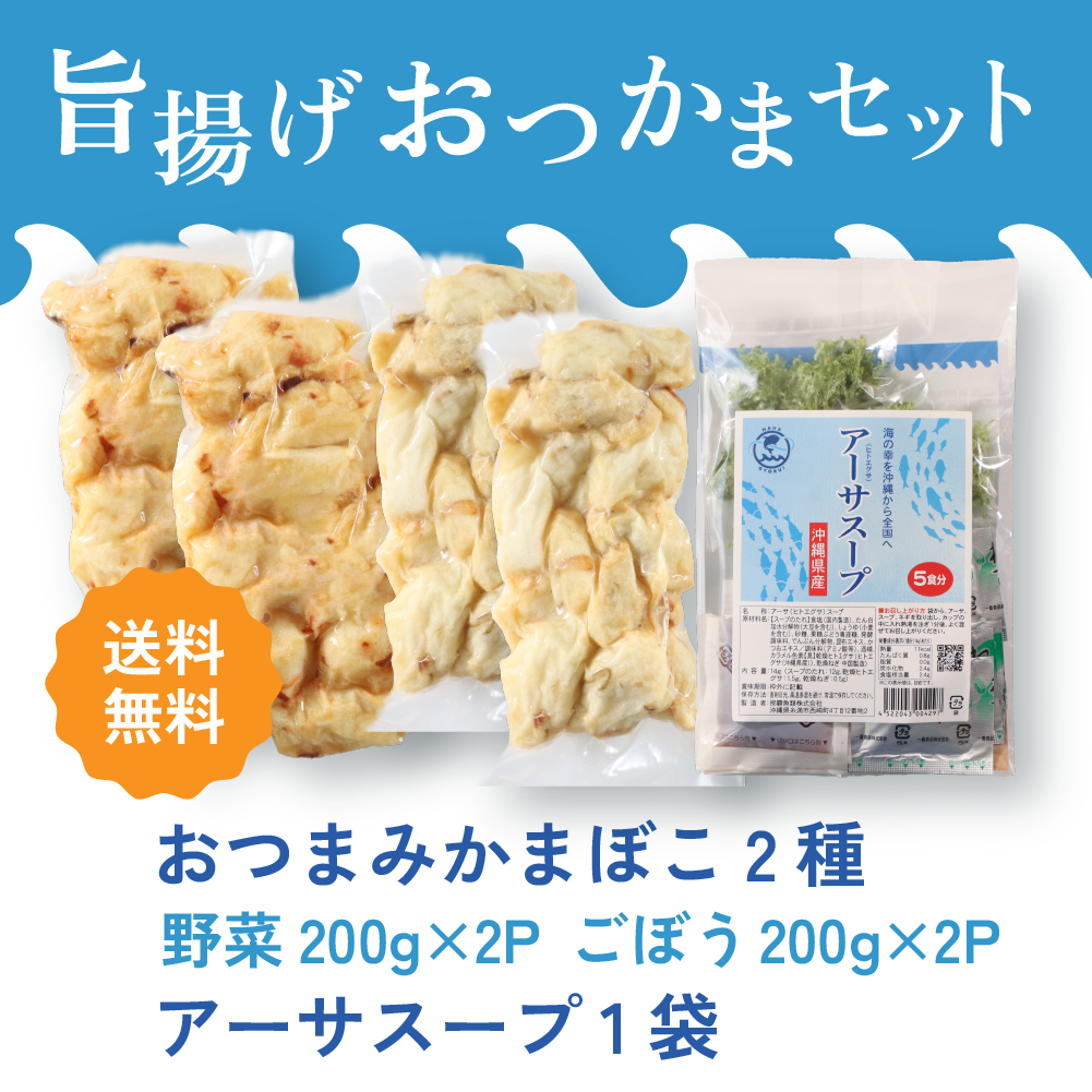 一口サイズの旨揚げおつまみかまぼこ、「おつかま」が2種とアーサスープが楽しめるお得なセットです!